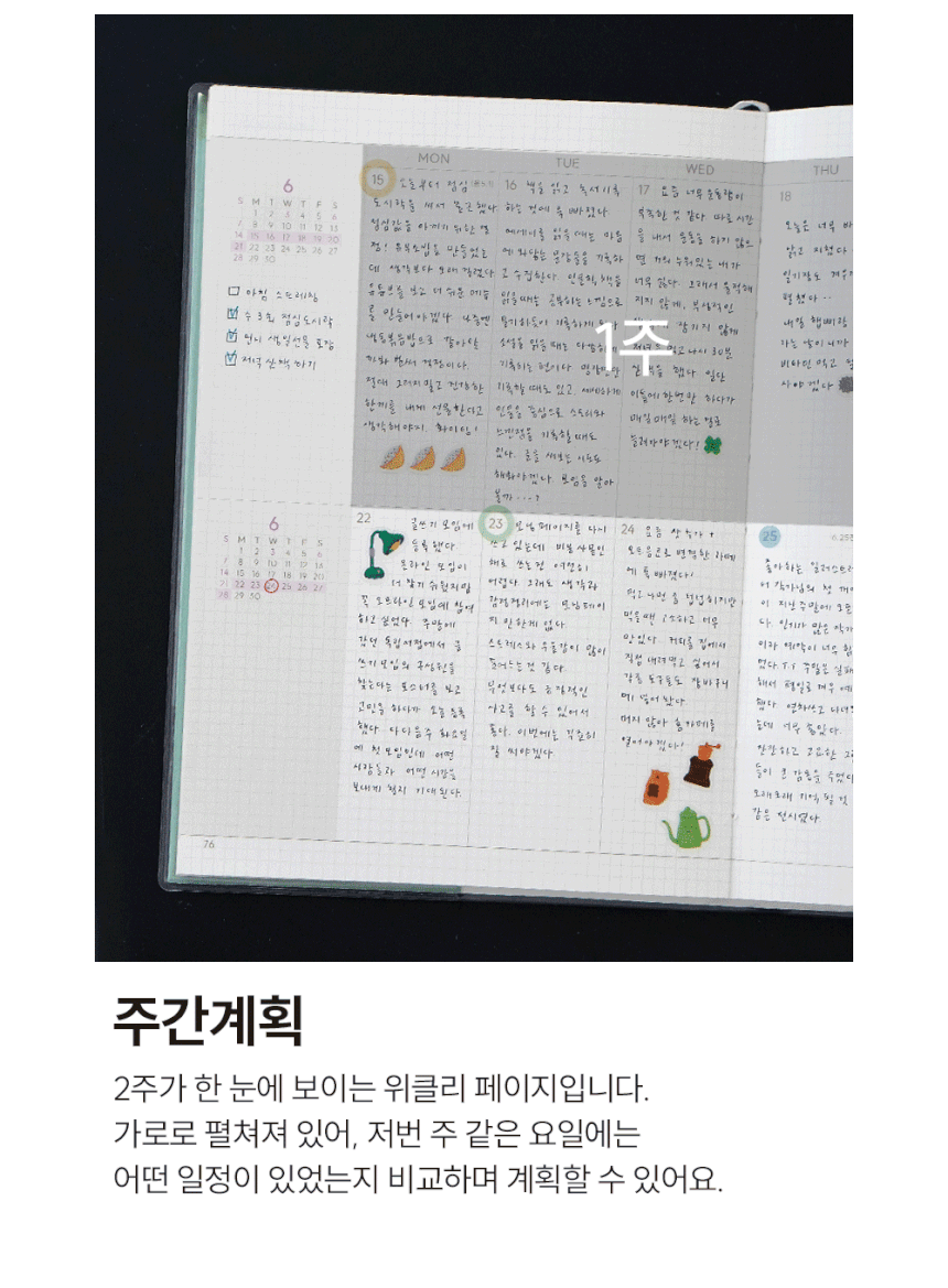키랑과 표지 2장이 세트! 다이어리 전체에 엷은 모눈이 깔려있어 필기에 용이해요
