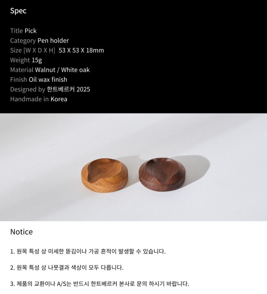 “PICK”은 만년필을 쉽게 들고 내려 놓을 수 있도록 디자인하였습니다. 목재의 가벼운 무게로 휴대가 간편해 어디서든 사용할 수 있습니다. 작은 크기지만 서피스 모델링을 통해 부드러운 곡