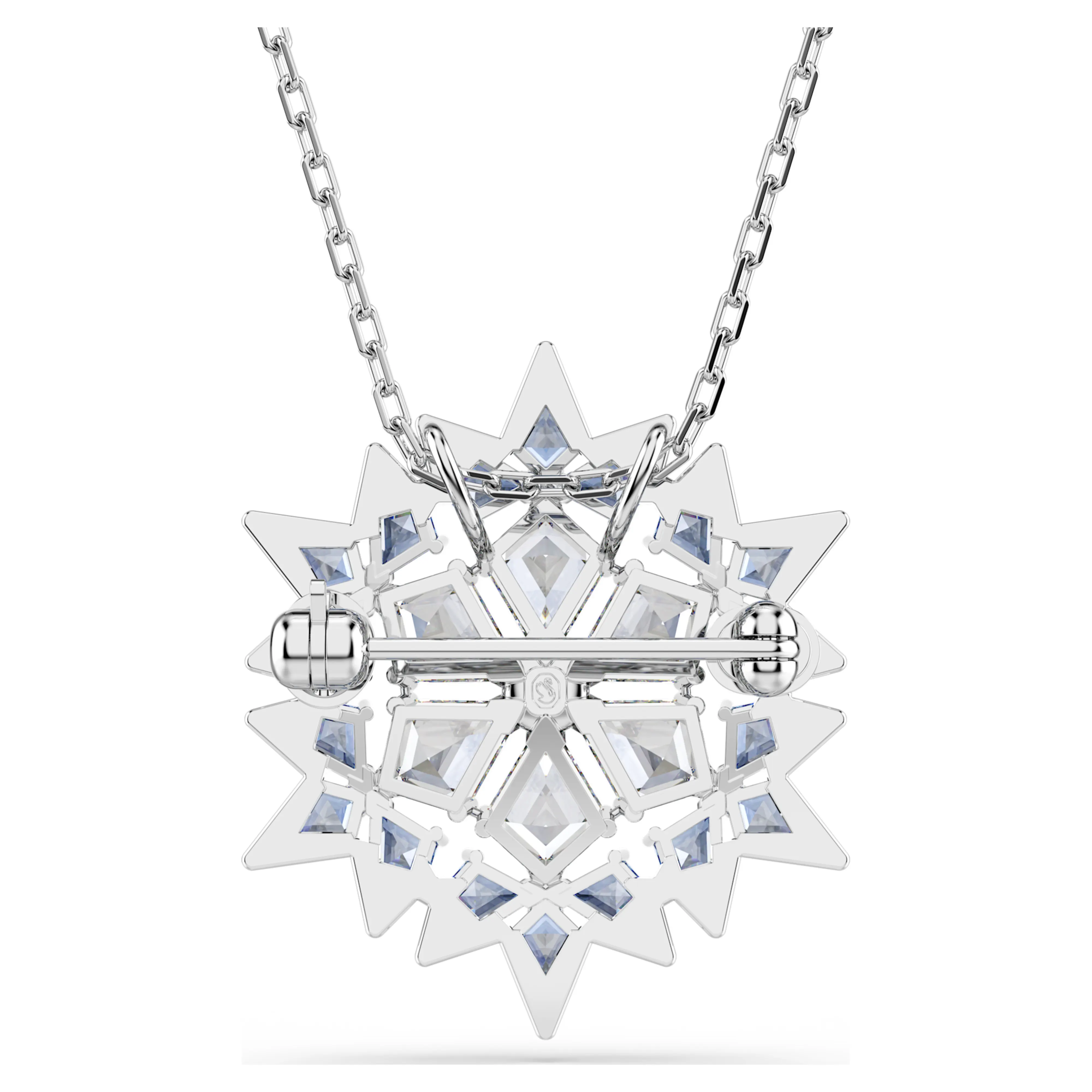 이 멀티 스타일 스노플레이크 펜던트의 매혹에 빠져보세요. 섬세한 체인에서 펜던트를 분리하여 브로치로 착용할 수 있습니다. 이 로듐 플래팅 디자인은 유행을 타지 않는 그레이 블루 Swarovski