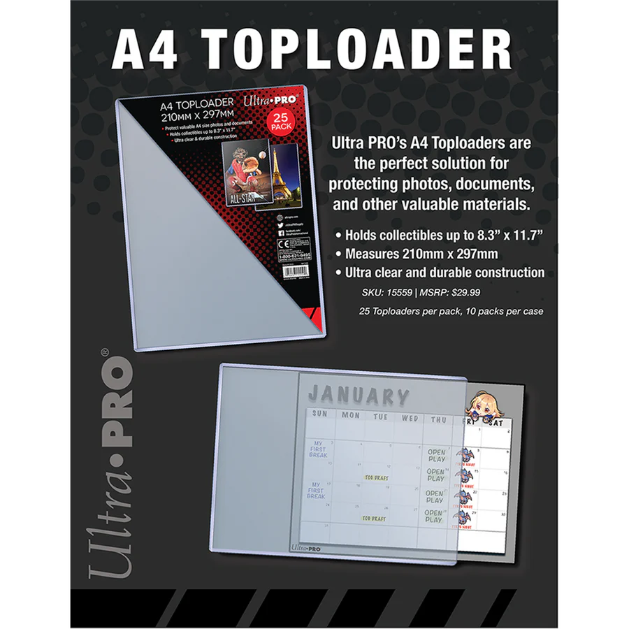 Keep your valuable documents, photos and collectible prints safe from dust, debris and damage with Ultra PRO's super clear A4 size Toploader. Sized to fit flat media content up to 210mm x 297mm (8.3" x 11.7") in size, these rigid PVC plastic holders are id